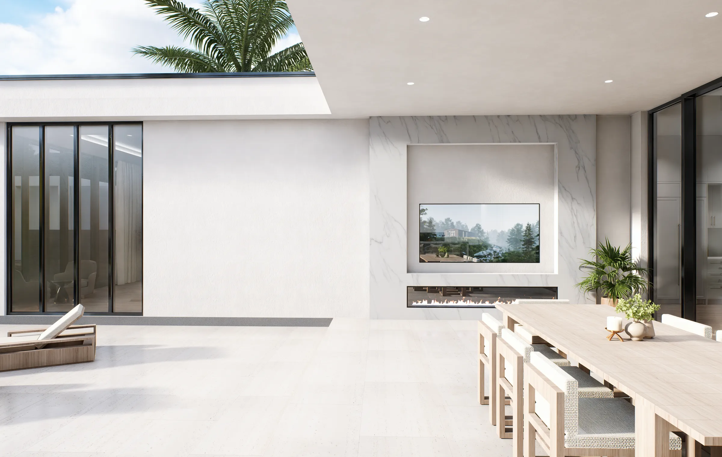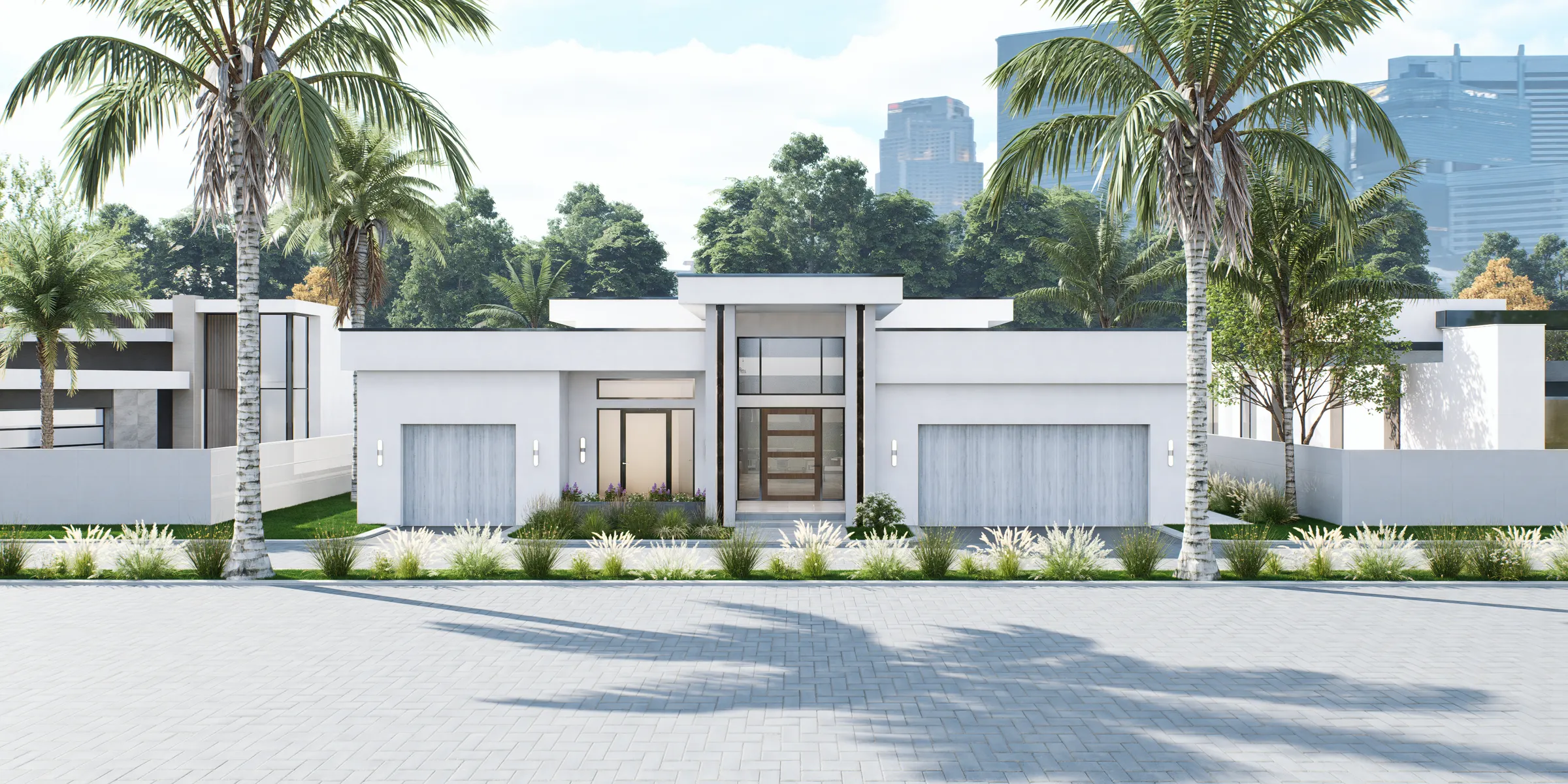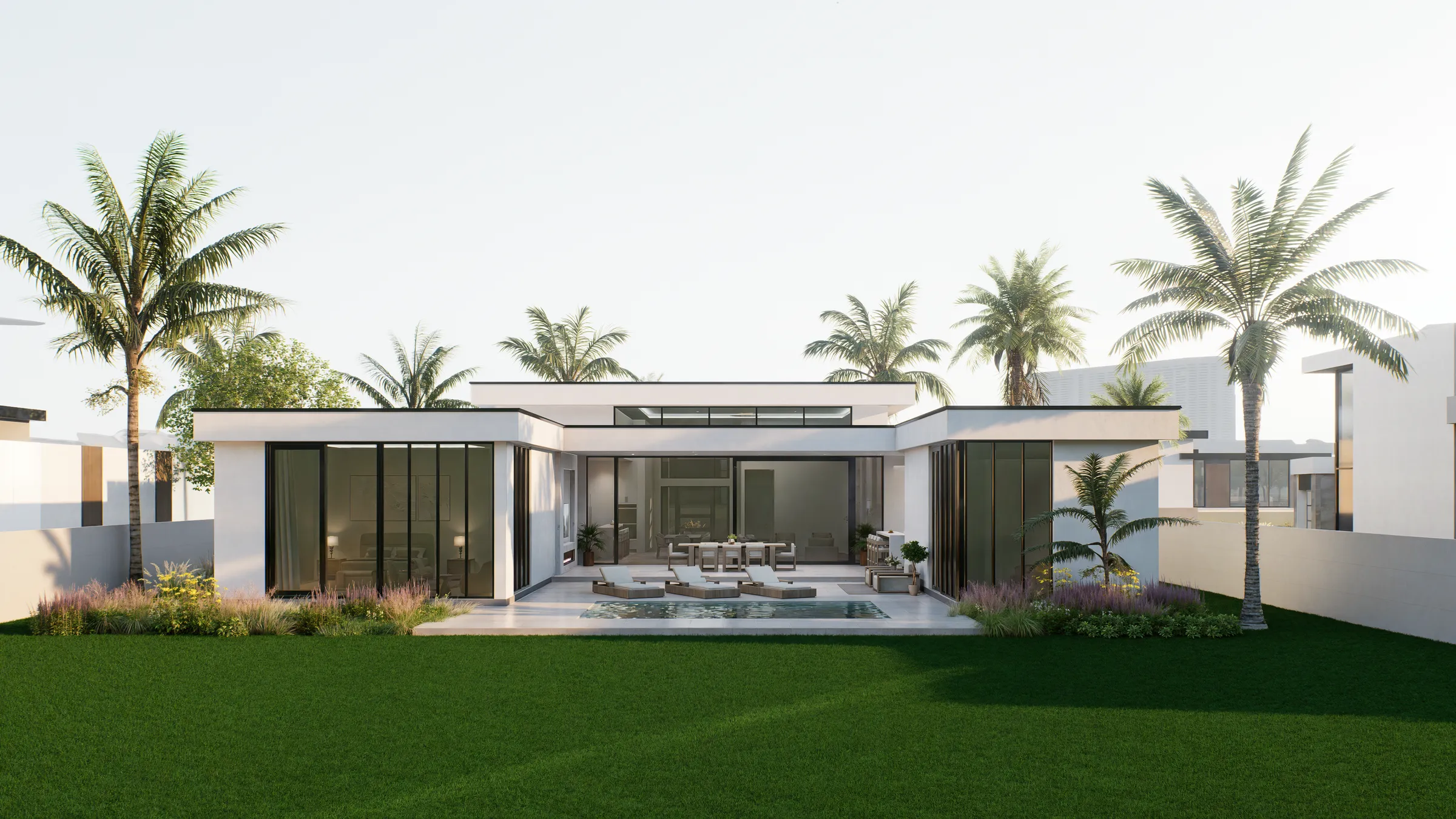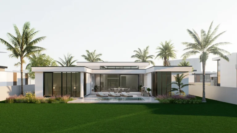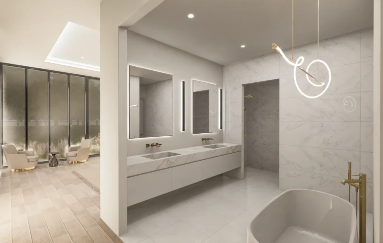 The Neptune model offers over 3,000 square feet of thoughtfully designed, air‑conditioned living space with a modern façade and lush landscaping that make a striking first impression. Expansive glass along the rear of the home frames the central living area and large patio, filling the interior with natural light and creating beautiful views of the outdoor spaces. The split-bedroom layout includes multiple en‑suite baths, a dedicated laundry and pantry, and a generous primary suite, all organized around the open living core for easy everyday flow. Its contemporary design is anchored by two spacious garages flanking the entry, giving the home both symmetry and ample storage for vehicles, hobbies, or boats.